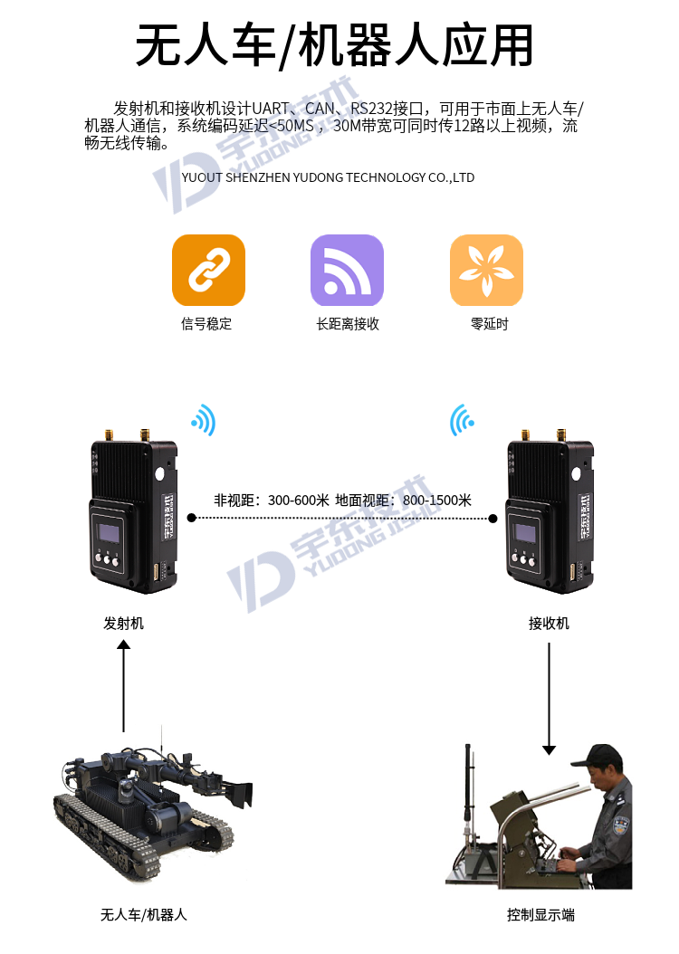 YDTD8000宇東視頻數據無線圖傳系統采用工業級無線高速率數據傳輸技術,非視距,非WIFI,集合正交頻分復用時分多址調制及MIMO多進多出容量技術,完全基于IP互聯網協議,實現全雙向透明通道傳輸。非視距:300-600米;地面視距:800-1500米;空對地:5000米。系統為純硬件連接,即插即用;創新性液晶一體化設計、豐富的CAN總線、RS-232、TTL電平接口,更好的用戶角度體驗。通道最大支持30Mbps吞吐量,可廣泛應用于工業自動化、工業機器人、無人機、視頻監控等通信工作。