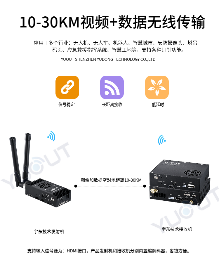 YD-HDT530-DM是應用于無人機行業的圖數控一體化超遠距離無線傳輸設備(最遠可達 15至30 公里),具有體積小、功耗低、通信距離遠等特點,支持高清視頻、飛控數據、云臺控制數據、遙控器控制數據等同時傳輸。