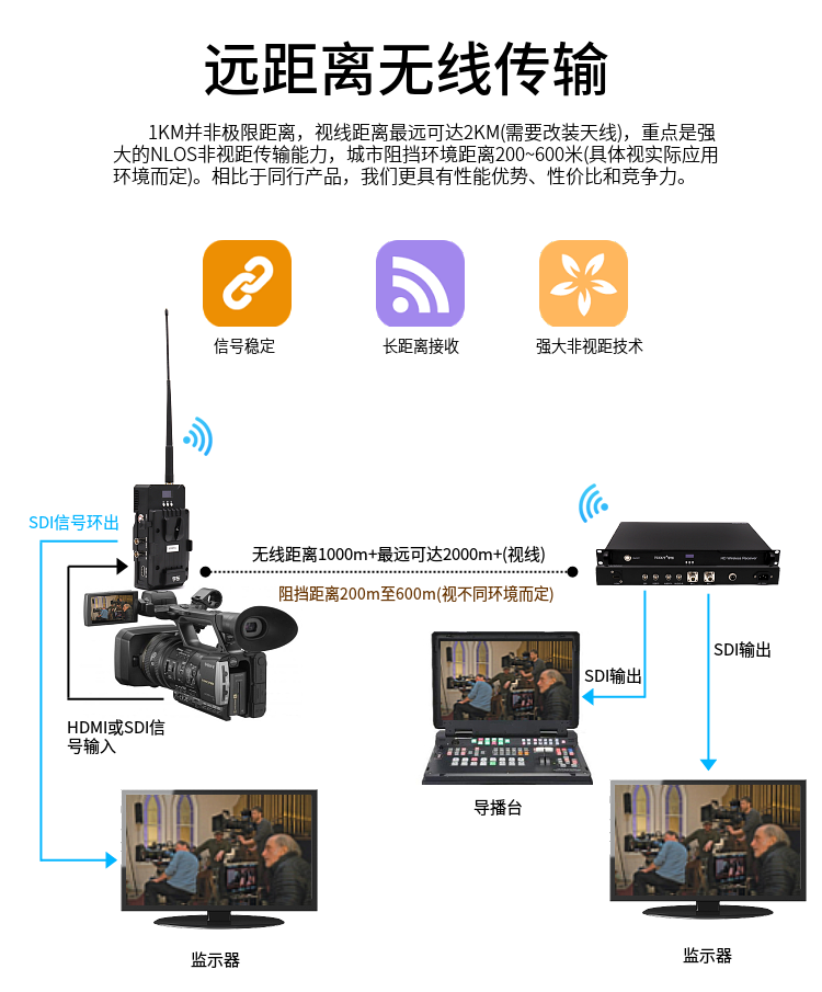 雷神2號無線圖傳雙V扣扳式廣電直播無線視頻傳輸系統,非視距(環境復雜、可穿墻、人多、車多、樹多及障礙物多的地方),高清無線圖像實時傳輸系統主應用于廣播電視臺、影視拍攝、教育直播、大型演唱會、電影電視制作、體育轉播、社會新聞、空中實況、演播室、公安、消防、海事、 交警、人防應急、城管執法、三防應急等方面。可訂制外觀及功能,地面視距:1~2公里;非視距:200~600米。具體視實際應用環境而定,可選擇HDMI輸入或SDI輸入, SDI輸出等。