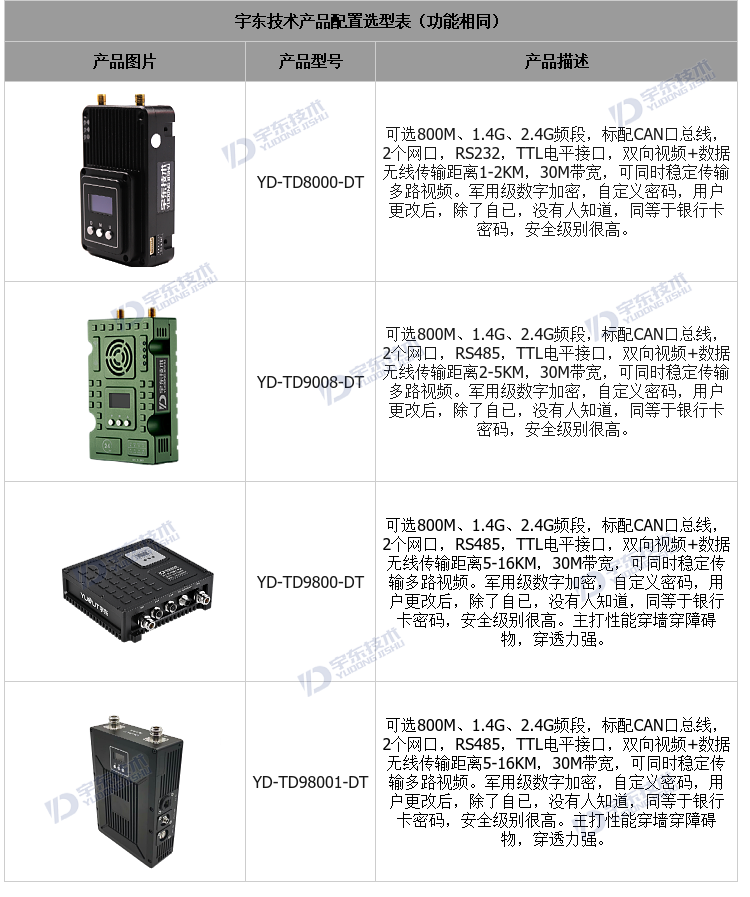 YD-TD9800-DT低時延無線圖傳系統,采用工業級無線高速跳頻傳輸技術,非視距,非WIFI,集合正交頻分復用時分多址調制及MIMO多進多出容量技術,完全基于IP互聯網協議,將信道資源在時間上通過時隙、頻率上通過子載波來靈活分配給多個用戶,在單一頻率點最大限度的提供多用戶接入,完全實現雙向透明通道傳輸。通道最大支持30Mbps吞吐量,視距可傳輸:10-18公里。系統為純硬件連接,即插即用;創新性液晶一體化設計、豐富的CAN總線、RS-232、TTL電平接口,更好的用戶角度體驗。且系統具有很強的抗多徑干擾能力,克服模擬技術和常規調制技術下多徑反射及遮擋所帶來的困擾,實現在復雜的環境下多點傳輸數據、視頻、音頻。可廣泛應用于工業自動化、工業機器人、無人機等通信工作。