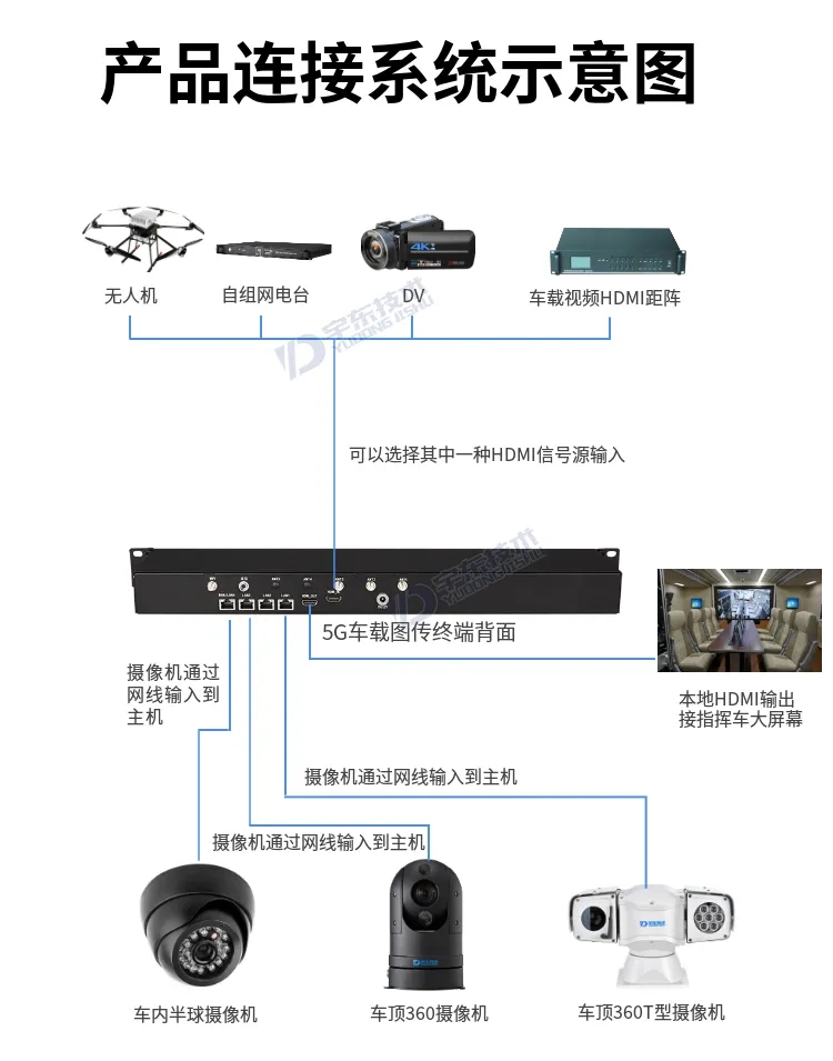 5、支持HDMI信號輸入,可接入無人機遙控器/指揮車視頻矩陣/DV攝像機等,本地HDMI高清視頻輸出