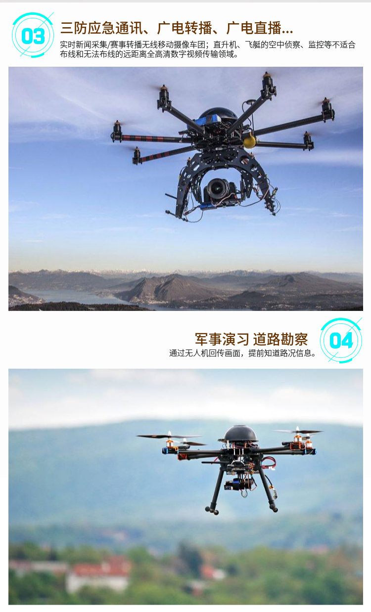 廣泛應用于軍事偵察、邊防巡邏、公安技偵、航拍、空中測繪、電力巡查、鐵路搶險、海事執法、城管執法、新聞密訪、衛生防疫等或突發事件應急指揮、無人車、無人船、特種機器人等領域。設備體積小可偽裝做密訪取證、空中作業圖傳、無人機無線圖像傳輸。